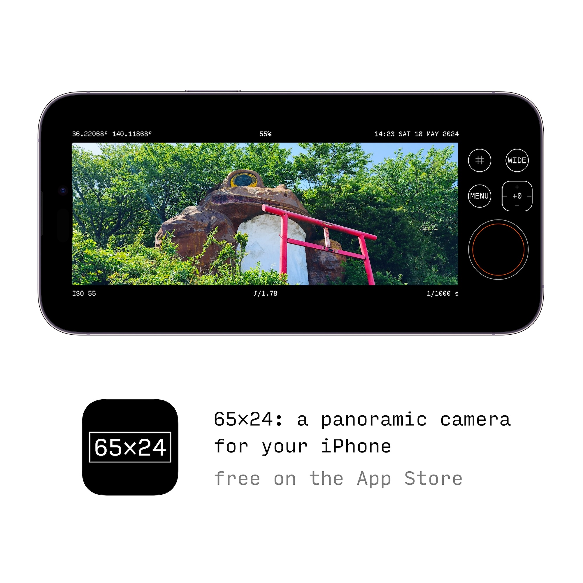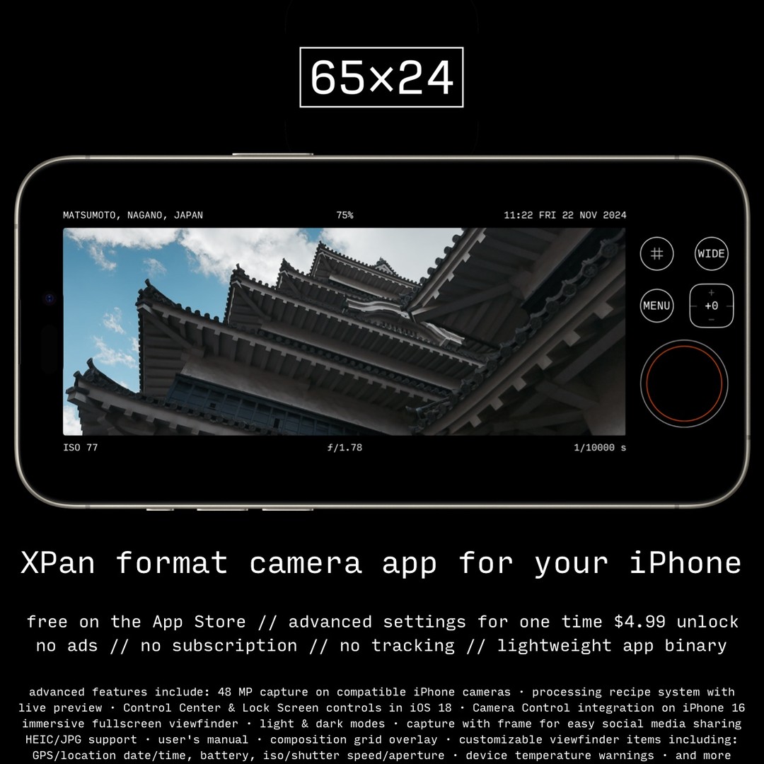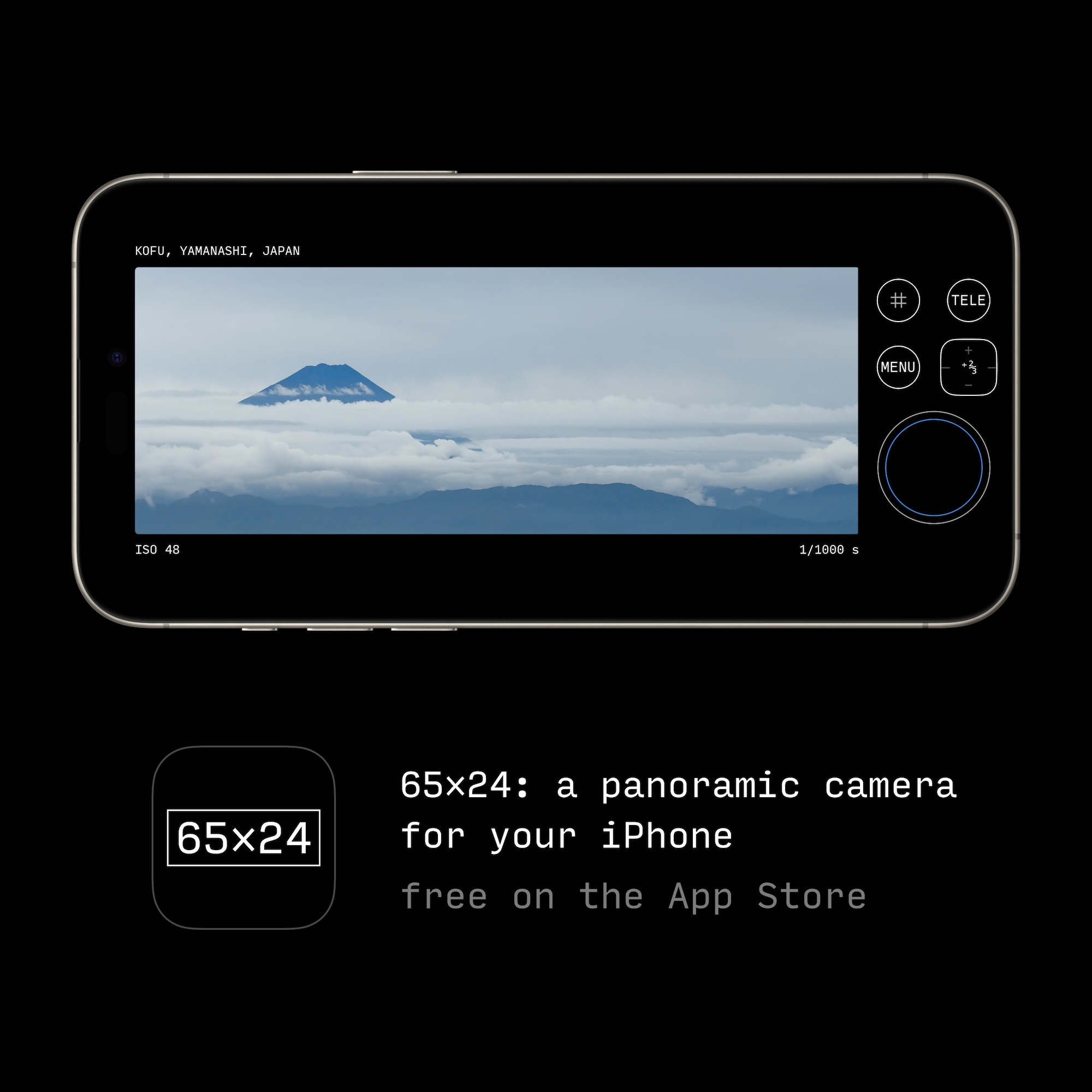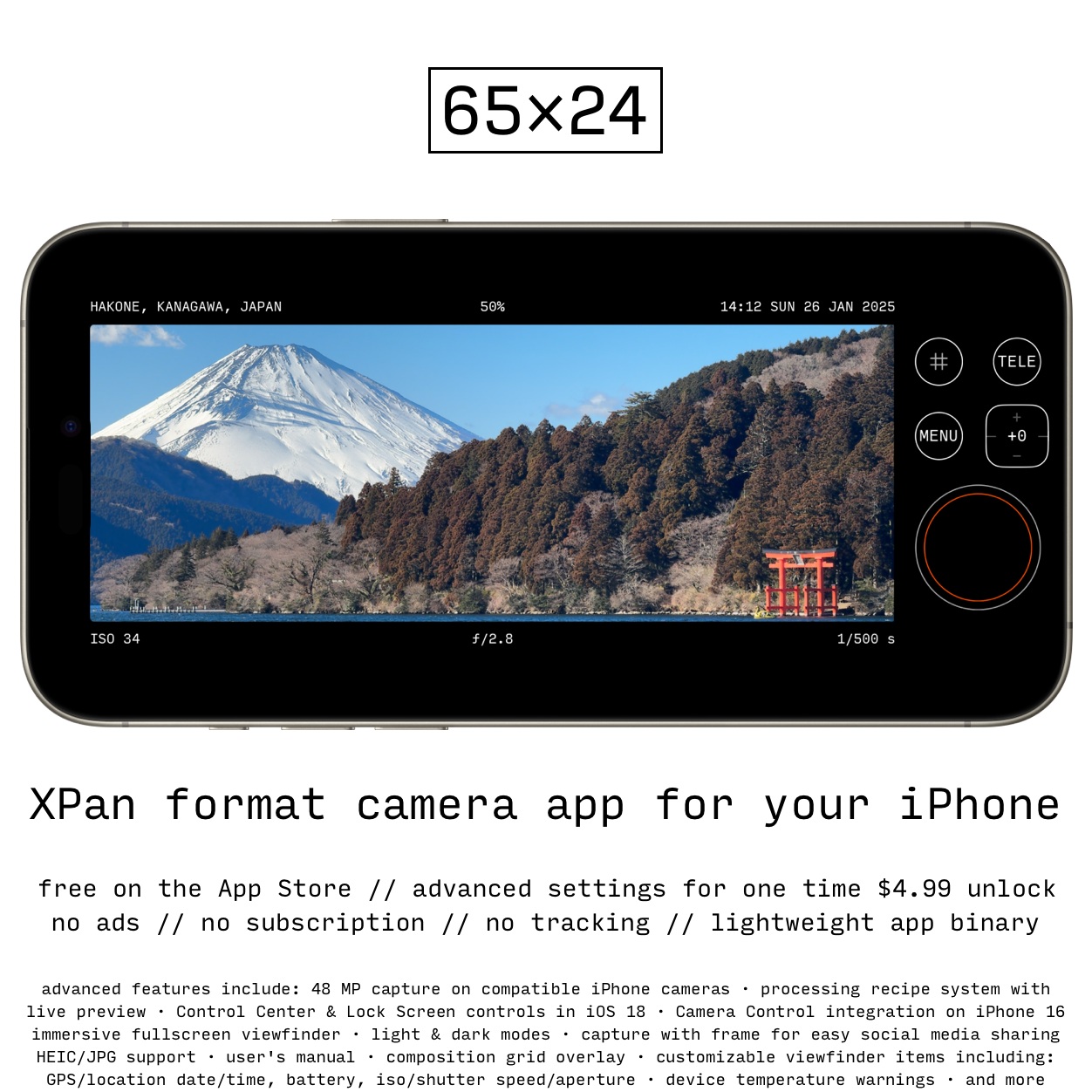 65×24 ("65 by 24") is a panoramic camera app for iPhone, which lets photographers compose and shoot in the iconic 65:24 (2.71) aspect ratio first pioneered by the Hasselblad X-Pan.Features